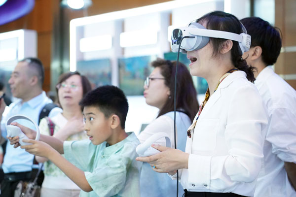 7月2日至5日,以“開啟數(shù)智新時(shí)代,共享數(shù)字新未來”為主題的2024全球數(shù)字經(jīng)濟(jì)大會(huì)在北京國家會(huì)議中心舉辦。圖為7月2日,觀眾在2024全球數(shù)字經(jīng)濟(jì)大會(huì)數(shù)字經(jīng)濟(jì)沉浸式體驗(yàn)區(qū)體驗(yàn)一款VR設(shè)備。新華社記者 任超 攝