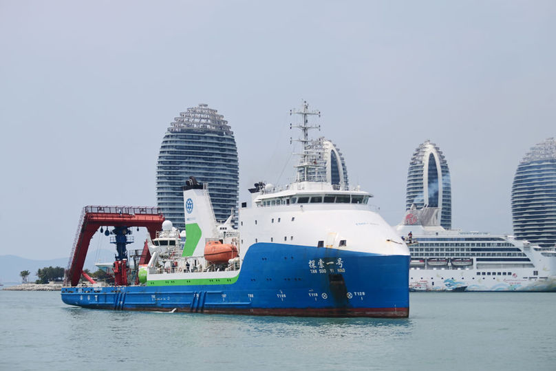 ??“探索一號(hào)”科考船搭載“奮斗者”號(hào)全海深載人潛水器返回海南三亞(2024年3月28日攝)。此次科考?xì)v時(shí)50天,順利完成中國(guó)-印度尼西亞爪哇海溝聯(lián)合深潛任務(wù)。新華社發(fā)(沙曉峰 攝)