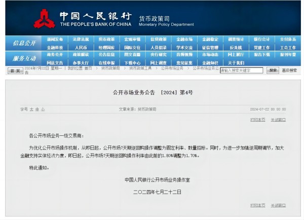 7月22日,央行發(fā)布公開市場業(yè)務(wù)公告,宣布即日起公開市場7天期逆回購操作采用固定利率、數(shù)量招標(biāo),操作利率由1.8%調(diào)整為1.7%。