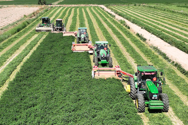 眼下,在巴彥淖爾市磴口縣包爾蓋農(nóng)場有機苜蓿產(chǎn)業(yè)園區(qū)內(nèi),5.8萬畝紫花苜蓿迎風搖曳,自走式割草機等大型機械來回穿梭,呈現(xiàn)一派繁忙的收獲景象。該園區(qū)負責人路建平說,他們通過優(yōu)化品種種植結(jié)構(gòu),大幅提升飼草畝均效益,確保苜蓿營養(yǎng)成分優(yōu)、品質(zhì)好、產(chǎn)量高,平均畝產(chǎn)1000千克左右。