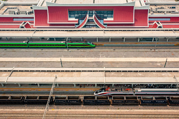“復(fù)興號”(上)、“瀾滄號”動車組列車??吭谥欣翔F路磨憨站。(新華社記者 胡超 攝)
