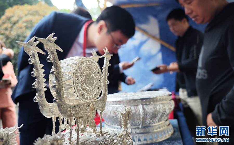 10月11日,參加茅臺(tái)酒節(jié)的嘉賓在茅臺(tái)中國(guó)酒文化城參觀苗族銀飾。新華網(wǎng) 盧志佳 攝