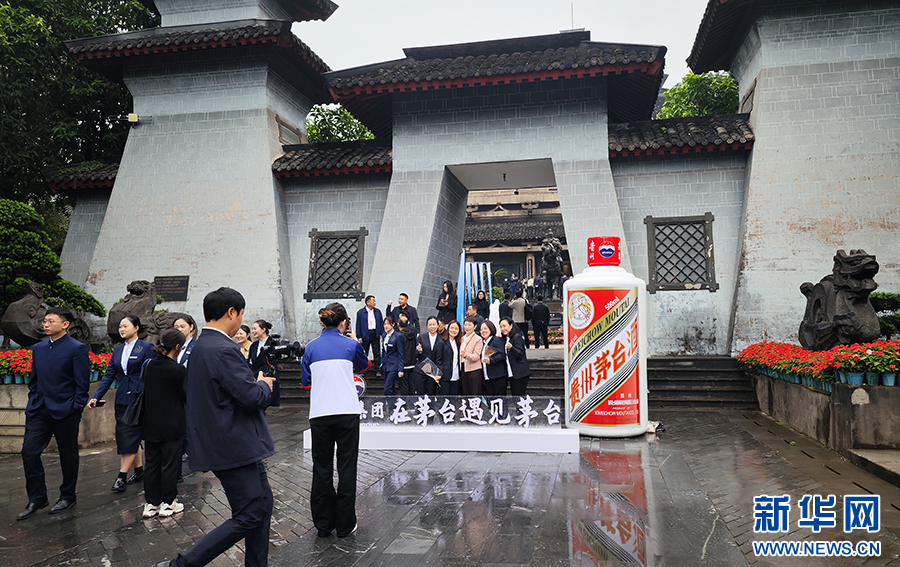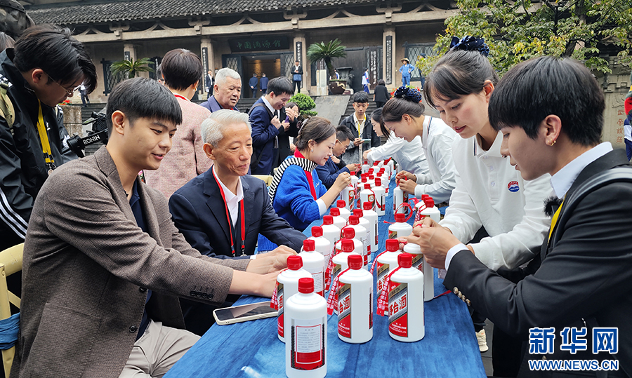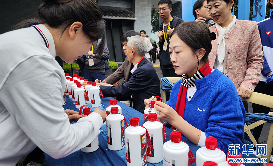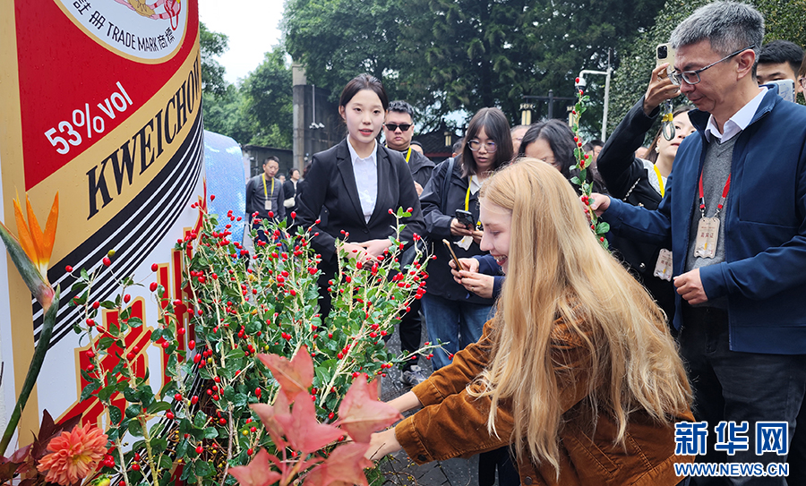 10月11日,參加茅臺(tái)酒節(jié)的嘉賓在茅臺(tái)中國(guó)酒文化城體驗(yàn)茅臺(tái)栓絲帶。新華網(wǎng) 盧志佳 攝