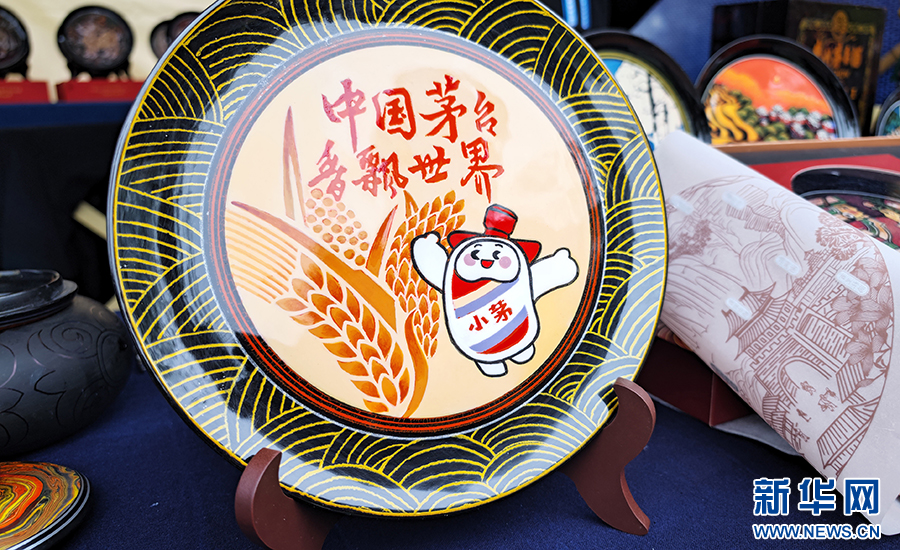 10月11日,以貴州大方漆器工藝制作的茅臺(tái)“小茅”形象漆器圓盤(pán)。新華網(wǎng) 盧志佳 攝