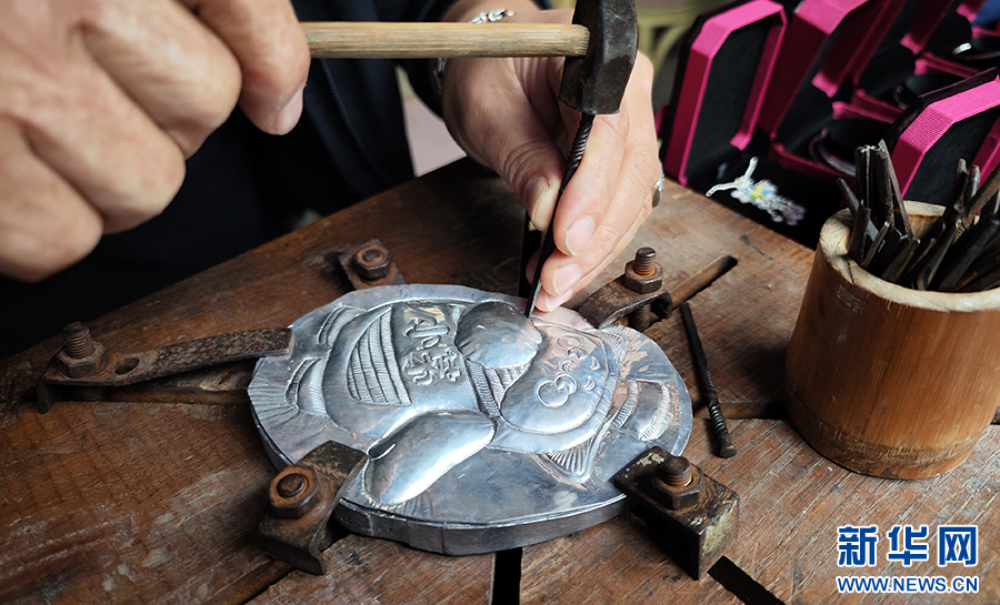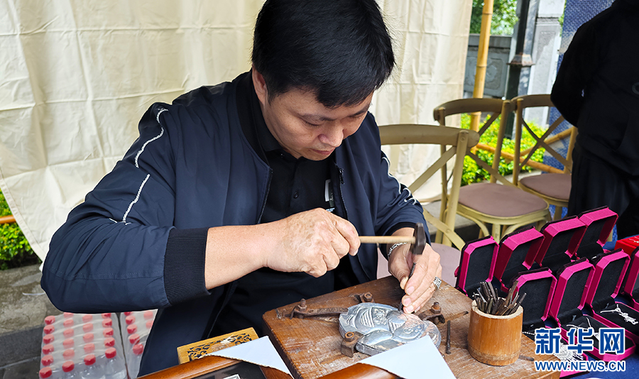 10月11日,貴州苗族銀飾非遺傳承人在茅臺(tái)酒節(jié)用銀鍛造茅臺(tái)“小茅”形象。新華網(wǎng) 盧志佳 攝
