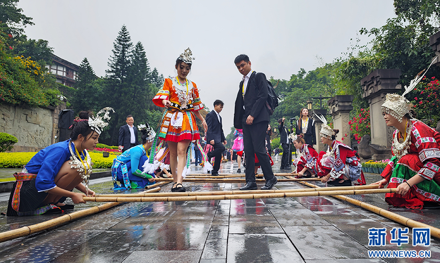 10月11日,參加茅臺(tái)酒節(jié)的嘉賓在茅臺(tái)中國(guó)酒文化城體驗(yàn)竹竿舞。新華網(wǎng) 盧志佳 攝
