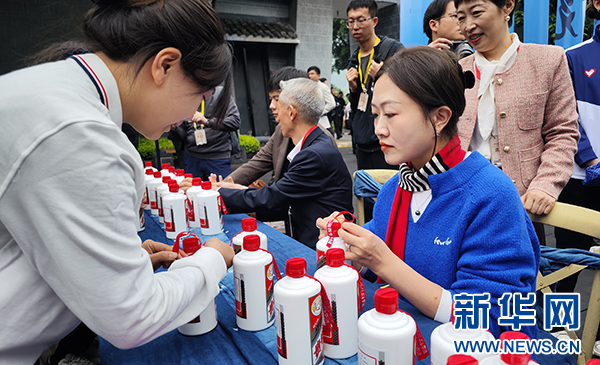10月11日,參加茅臺酒節(jié)的嘉賓在茅臺中國酒文化城體驗茅臺栓絲帶。新華網(wǎng) 盧志佳 攝