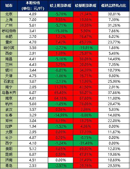 分價(jià)格區(qū)間來(lái)看,本期超市食用鹽銷(xiāo)售單價(jià)在5元/斤以上的城市有6個(gè),分別是上海、廣州、烏魯木齊、杭州、貴陽(yáng)、昆明;超市食用鹽銷(xiāo)售單價(jià)在4-5元/斤之間的城市有9個(gè),分別是北京、重慶、南昌、蘭州、天津、南京、長(zhǎng)沙、西寧、濟(jì)南;超市食用鹽銷(xiāo)售單價(jià)在3-4元/斤之間的城市有7個(gè),分別是呼和浩特、哈爾濱、銀川、石家莊、武漢、長(zhǎng)春、鄭州;超市食用鹽銷(xiāo)售單價(jià)在3元/斤以下的城市有6個(gè),分別是合肥、西安、南寧、拉薩、太原、青島。