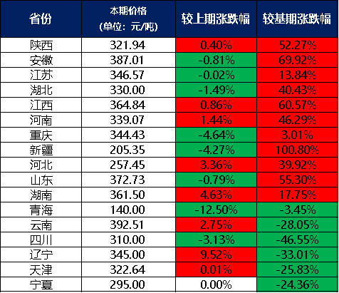 分價格區(qū)間來看,本期兩堿工業(yè)鹽單價在300元/噸及以上的地區(qū)有13個,是陜西、安徽、江蘇、湖北、江西、河南、重慶、山東、湖南、云南、四川、遼寧、天津;兩堿工業(yè)鹽單價在300元/噸以下的地區(qū)有4個,分別是新疆、河北、青海、寧夏。