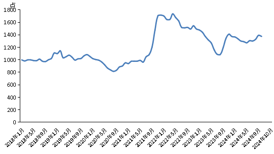 10月份,新華·中鹽兩堿工業(yè)鹽價格指數(shù)報1375.48點,較上期(2024年9月)下跌18.20點,跌幅1.31%;較基期(2018年1月)上漲375.48點,漲幅37.55%;較周期內(nèi)最高點1736.66點(2022年4月)下跌361.18點,跌幅20.80%;較周期內(nèi)最低點816.2點(2020年8月)上漲559.28點,漲幅68.52%。