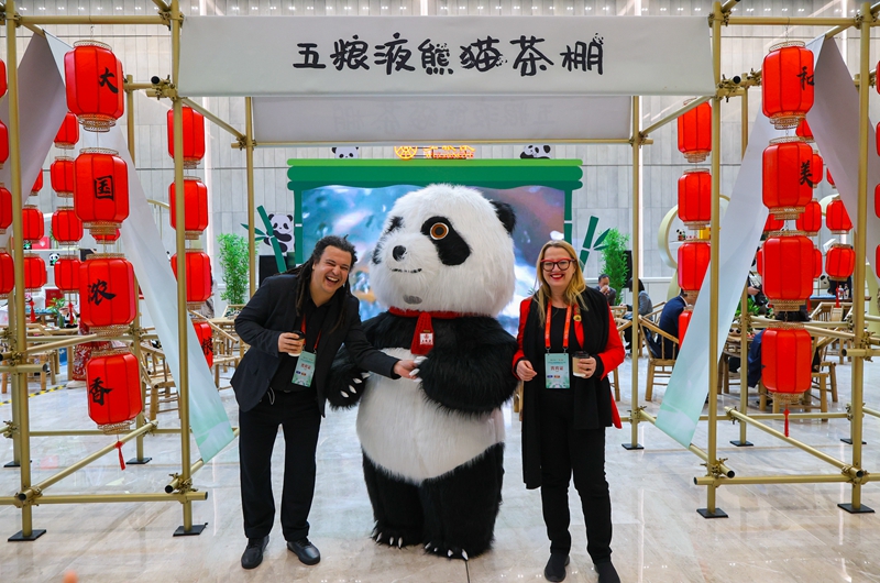 大會期間,嘉賓在五糧液熊貓茶棚與熊貓人偶合影。