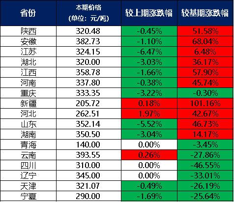 分價格區(qū)間來看,本期兩堿工業(yè)鹽單價在300元/噸及以上的地區(qū)有13個,是陜西、安徽、江蘇、湖北、江西、河南、重慶、山東、湖南、云南、四川、遼寧、天津;兩堿工業(yè)鹽單價在300元/噸以下的地區(qū)有4個,分別是新疆、河北、青海、寧夏。