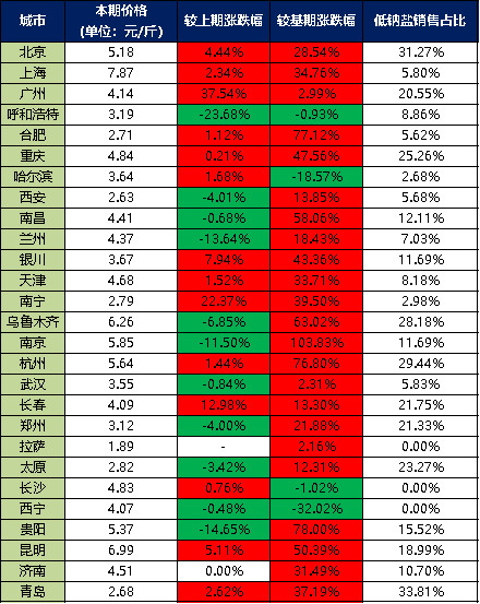 分價(jià)格區(qū)間來(lái)看,本期超市食用鹽銷售單價(jià)在5元/斤以上的城市有7個(gè),分別是北京、上海、烏魯木齊、南京、杭州、貴陽(yáng)、昆明;超市食用鹽銷售單價(jià)在4-5元/斤之間的城市有9個(gè),分別是廣州、重慶、南昌、蘭州、天津、長(zhǎng)春、長(zhǎng)沙、西寧、濟(jì)南;超市食用鹽銷售單價(jià)在3-4元/斤之間的城市有5個(gè),分別是呼和浩特、哈爾濱、銀川、武漢、鄭州;超市食用鹽銷售單價(jià)在3元/斤以下的城市有6個(gè),分別是合肥、西安、南寧、拉薩、太原、青島。