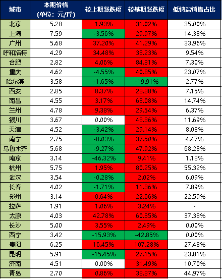 分價(jià)格區(qū)間來(lái)看,本期超市食用鹽銷售單價(jià)在5元/斤以上的城市有7個(gè),分別是北京、上海、廣州、烏魯木齊、杭州、貴陽(yáng)、昆明;超市食用鹽銷售單價(jià)在4-5元/斤之間的城市有9個(gè),分別是呼和浩特、重慶、南昌、蘭州、天津、長(zhǎng)春、太原、長(zhǎng)沙、濟(jì)南;超市食用鹽銷售單價(jià)在3-4元/斤之間的城市有6個(gè),分別是哈爾濱、銀川、南京、武漢、鄭州、西寧;超市食用鹽銷售單價(jià)在3元/斤以下的城市有5個(gè),分別是合肥、西安、南寧、拉薩、青島。