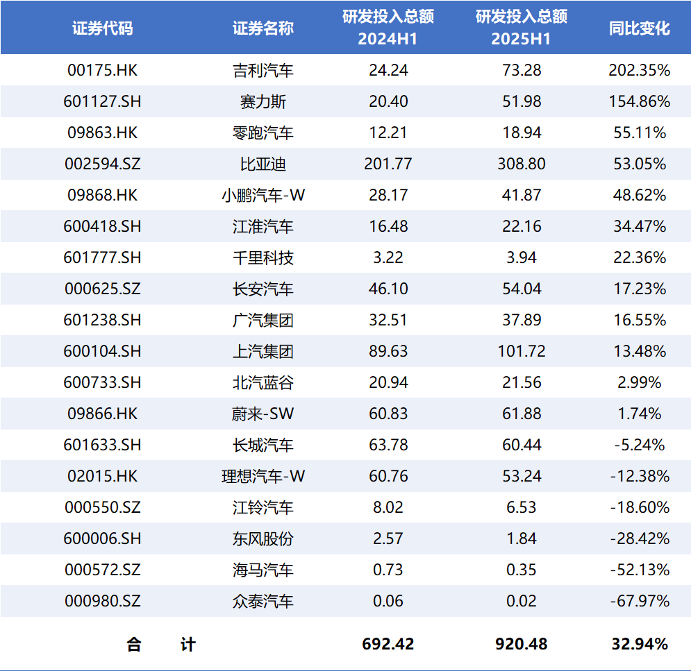 在乘用車(chē)市場(chǎng)競(jìng)爭(zhēng)激烈之際,上市車(chē)企正試圖在盈利水平與研發(fā)投入之間找到平衡點(diǎn)。同花順iFinD數(shù)據(jù)顯示,截至9月2日,已披露的18家上市車(chē)企(A股+H股)今年上半年研發(fā)投入(費(fèi)用化研發(fā)支出+資本化研發(fā)支出)合計(jì)920.48億元,同比增長(zhǎng)32.94%。受車(chē)企盈利能力等因素影響,車(chē)企研發(fā)投入強(qiáng)度出現(xiàn)分化,納入統(tǒng)計(jì)的18家車(chē)企中,12家車(chē)企的研發(fā)投入同比實(shí)現(xiàn)正增長(zhǎng),占比為66.67%,吉利汽車(chē)(00175.HK)、賽力斯(601127.SH)、零跑汽車(chē)(09863.HK)等公司研發(fā)投入同比增幅居前,而長(zhǎng)城汽車(chē)(601633.SH)、理想汽車(chē)(02015.HK)等車(chē)企研發(fā)投入同比減少。