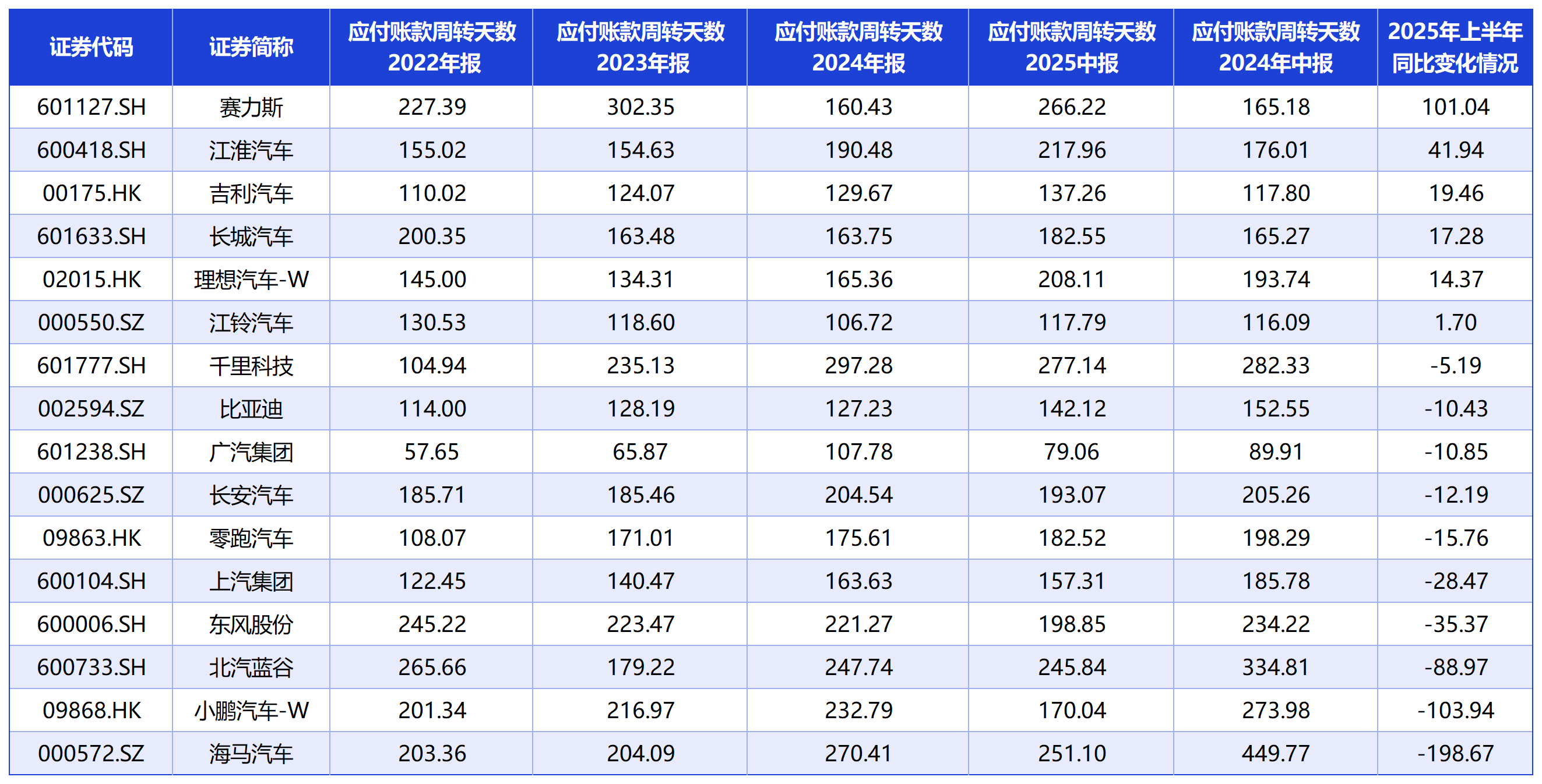 從應(yīng)付賬款周轉(zhuǎn)角度來看,今年上半年,16家車企中有10家車企應(yīng)付賬款周轉(zhuǎn)天數(shù)較2024年同期減少,車企數(shù)量占比為62.5%。長城汽車、理想汽車、賽力斯等車企應(yīng)付賬款周轉(zhuǎn)天數(shù)同比均增加。特別是賽力斯,今年上半年的應(yīng)付賬款周轉(zhuǎn)天數(shù)為266.22天,較2024年同期的165.18天增加了101.04天,其增幅位居16家車企之首。