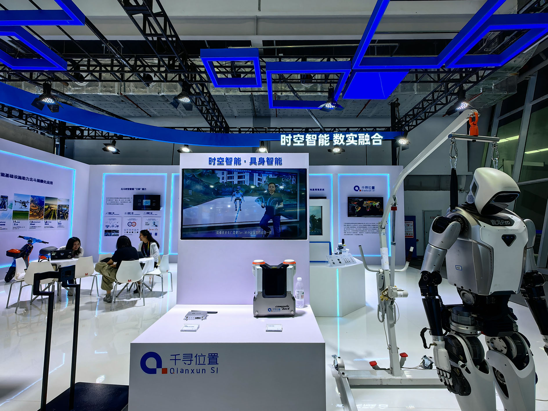圖為第四屆北斗規(guī)模應(yīng)用國(guó)際峰會(huì)上展出的“時(shí)空算力背包”和“青龍Pro”人形機(jī)器人。記者 蘇曉洲 攝