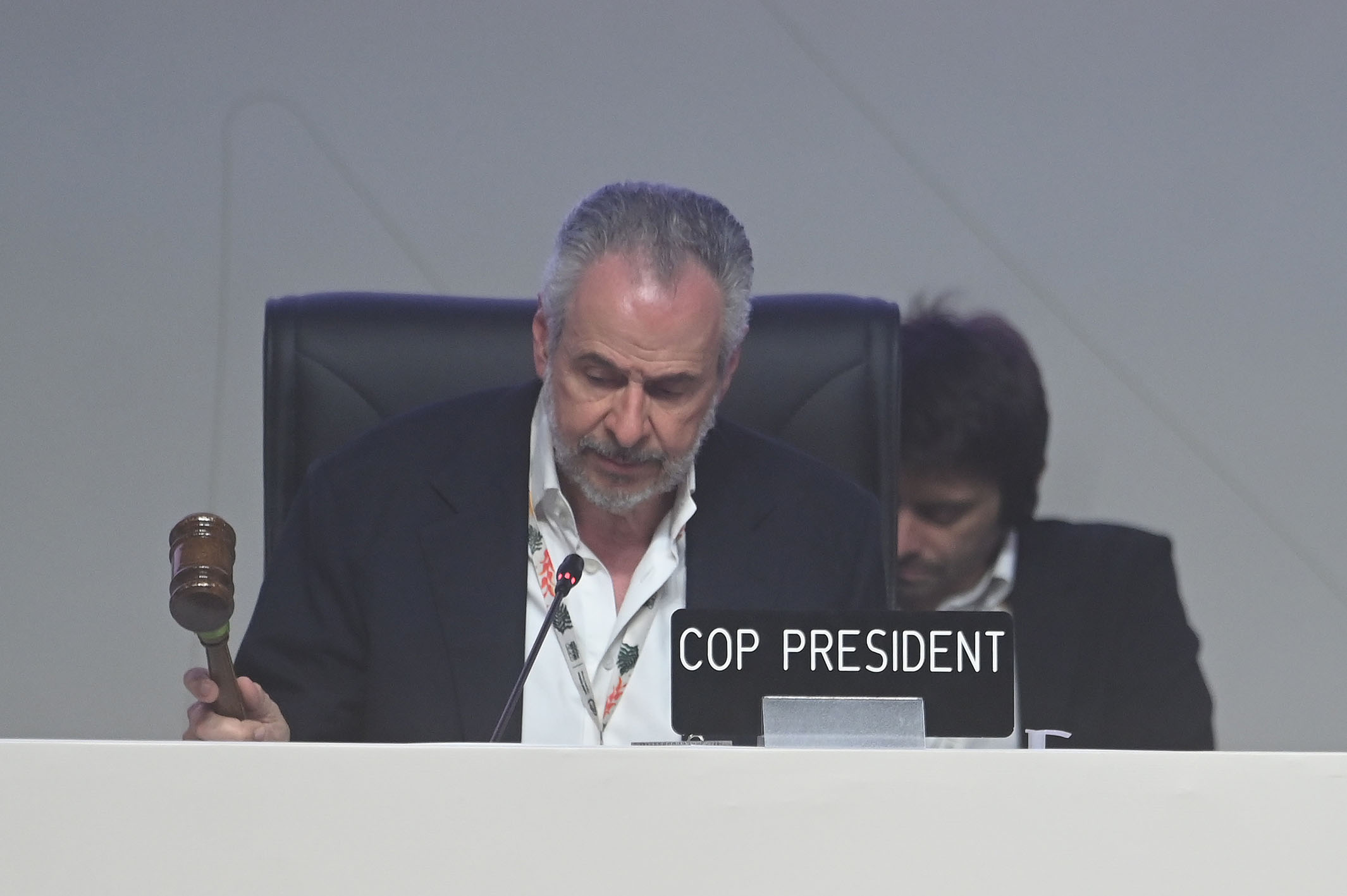 圖為在《聯(lián)合國氣候變化框架公約》第三十次締約方大會上,大會主席多拉戈敲槌確認(rèn)會議決定。新華社發(fā)(盧西奧·塔沃拉 攝)
