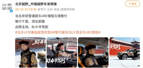 北京越野的宣傳海報(bào)顯示,身著清宮服飾、梳長(zhǎng)辮的模特與BJ40越野車(chē)在故宮紅墻雪景前合影,配文“此即主場(chǎng),BJ4爺駕到”。該設(shè)計(jì)本欲借“BJ40”諧音塑造“四爺”尊貴形象,然而公眾對(duì)此卻并不“買(mǎi)賬”。