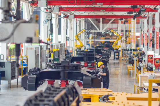 4月21日,在位于重慶市兩江新區(qū)的一家機械制造企業(yè),工作人員在總裝車間組裝即將出口老撾、緬甸的挖掘機。(黃偉 攝)