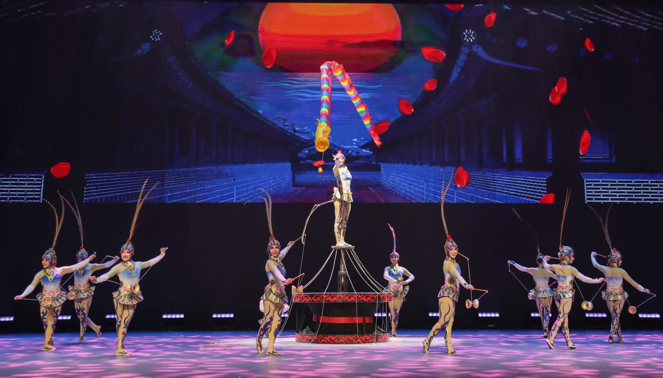 演出盡顯中華優(yōu)秀傳統(tǒng)文化之美。《龍躍神州——中幡》集“驚險奇美”于一身,融入京劇元素、古典舞與武術(shù)的動作特點,騰挪翻轉(zhuǎn)間將古老中幡藝術(shù)的雄渾與新時代的昂揚氣象徐徐鋪展。《梁?!缟习爬佟芬粤鹤楣适禄€,女演員在男演員“3厘米見方”的肩上和頭上展翅起舞,完成足尖站肩等一系列高難度動作?!肚位ǖw空竹》通過服飾、音樂、動作、身段等京劇元素在節(jié)目中的大膽成功運用,文活武演,體現(xiàn)了國粹的大氣、典雅、華麗,展現(xiàn)了精雕細琢的京味風情。《大魚——吊環(huán)》以高空吊環(huán)為載體,結(jié)合流行樂曲《大魚》,演員宛如靈動的魚兒,輕盈地穿梭于環(huán)間,將觀眾帶入充滿詩意與浪漫的海洋世界。