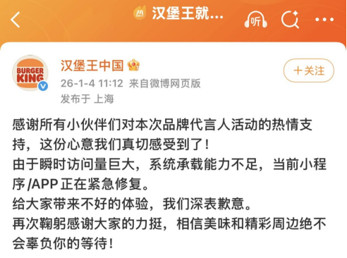 隨后,當(dāng)日午間“漢堡王中國(guó)”發(fā)文回應(yīng):“由于瞬時(shí)訪(fǎng)問(wèn)量巨大,系統(tǒng)承載能力不足,當(dāng)前小程序/APP正在緊急修復(fù)。給大家?guī)?lái)不好的體驗(yàn),我們深表歉意。再次鞠躬感謝大家的力挺,相信美味和精彩周邊絕不會(huì)辜負(fù)你的等待!”