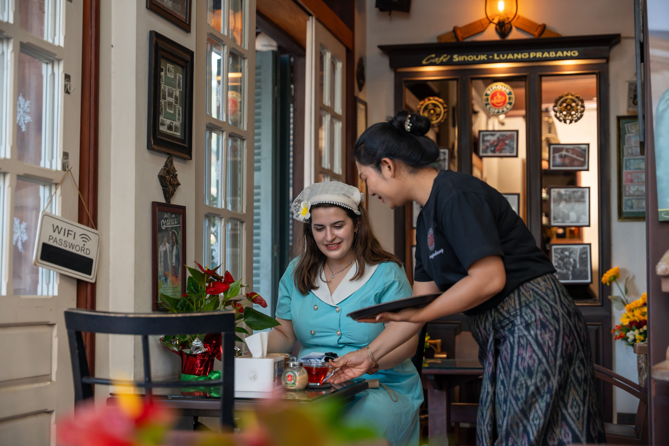 圖為在老撾瑯勃拉邦一家咖啡店,服務(wù)員為顧客端上咖啡。