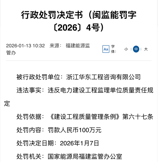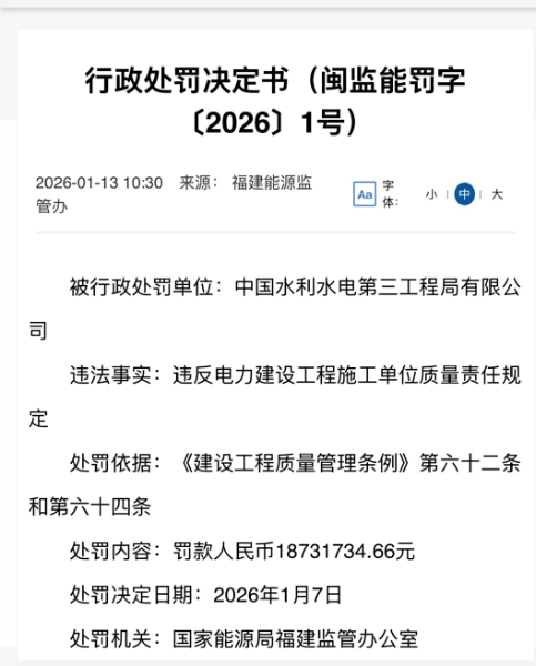 1月13日,國家能源局福建監(jiān)管辦公室發(fā)布了三則《行政處罰決定書》(閩監(jiān)能罰字【2026】1號、2號、4號),福建永安抽水蓄能電站的施工、業(yè)主、監(jiān)理三家單位合計(jì)被罰超1978萬元。
