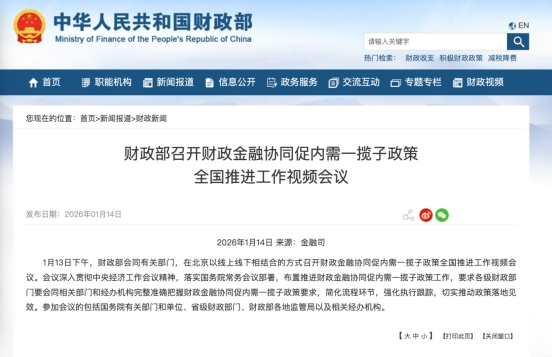 記者從財(cái)政部獲悉,1月13日,財(cái)政部會(huì)同有關(guān)部門(mén),在北京以線(xiàn)上線(xiàn)下相結(jié)合的方式召開(kāi)財(cái)政金融協(xié)同促內(nèi)需一攬子政策全國(guó)推進(jìn)工作視頻會(huì)議。