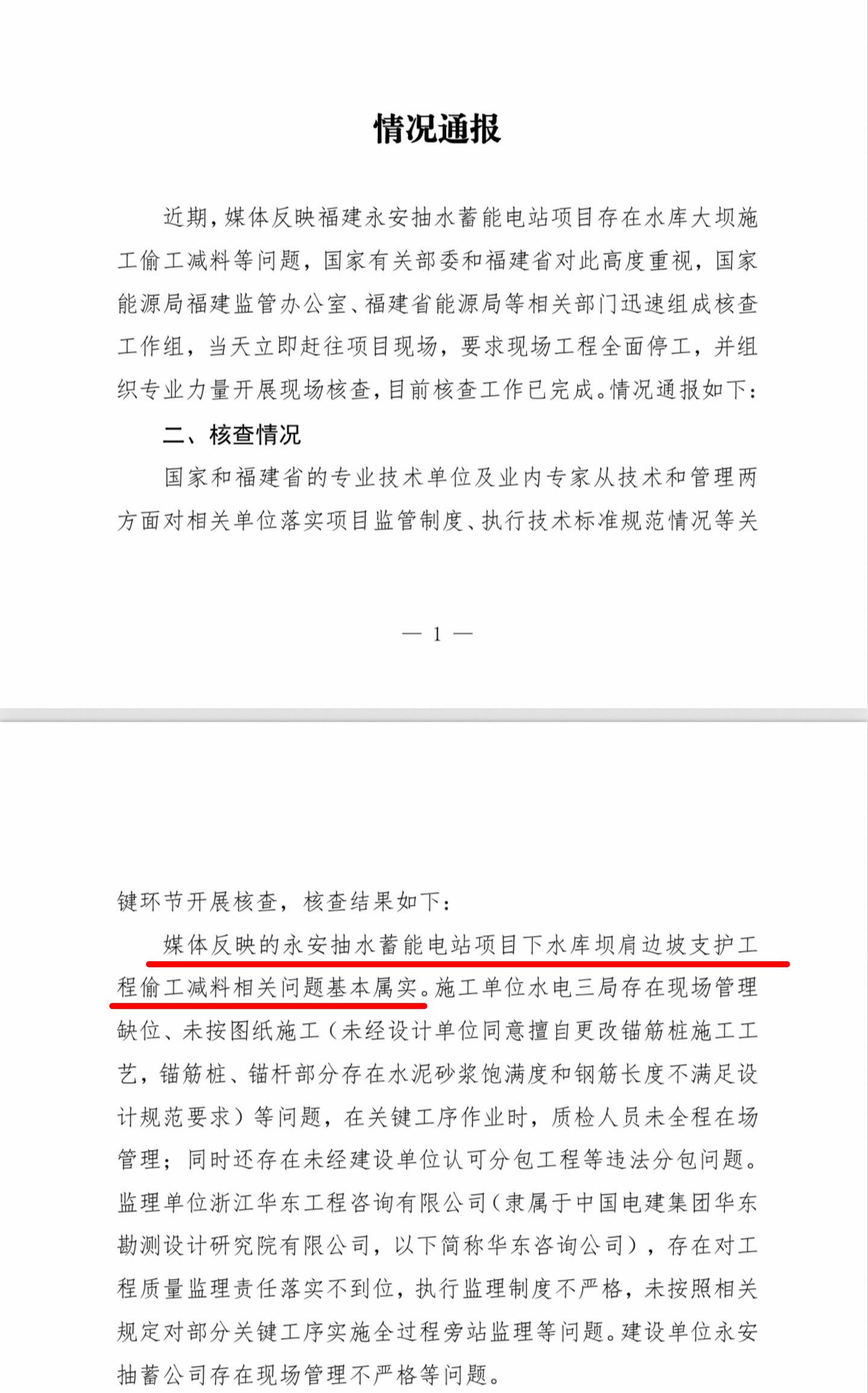 1月14日,國家能源局福建監(jiān)管辦公室發(fā)布《情況通報(bào)》稱,《經(jīng)濟(jì)參考報(bào)》報(bào)道的福建永安抽水蓄能電站項(xiàng)目下水庫壩肩邊坡支護(hù)工程偷工減料相關(guān)問題基本屬實(shí)。涉事施工單位中國水利水電第三工程局有限公司(隸屬于中國電建,以下簡稱“水電三局”)因存在現(xiàn)場(chǎng)管理缺位、未按圖紙施工、違法分包等問題被依法追責(zé)。涉事監(jiān)理單位浙江華東工程咨詢有限公司(隸屬于中國電建集團(tuán)華東勘測(cè)設(shè)計(jì)研究院有限公司,以下簡稱“華東咨詢公司”)、涉事建設(shè)單位福建閩投永安抽水蓄能有限公司(隸屬于福建投資集團(tuán),以下簡稱“永安抽蓄公司”)也因存在監(jiān)理缺位、現(xiàn)場(chǎng)管理不嚴(yán)等問題被行政處罰。