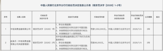 據(jù)處罰信息顯示,中信消金本次涉及的違法行為包括異議處理超期、未按規(guī)定對(duì)異議進(jìn)行書面回復(fù)、未按規(guī)定對(duì)異議信息進(jìn)行標(biāo)注、未準(zhǔn)確報(bào)送個(gè)人信用信息。對(duì)于上述違法行為,中國(guó)人民銀行北京市分行對(duì)其罰款105萬元。