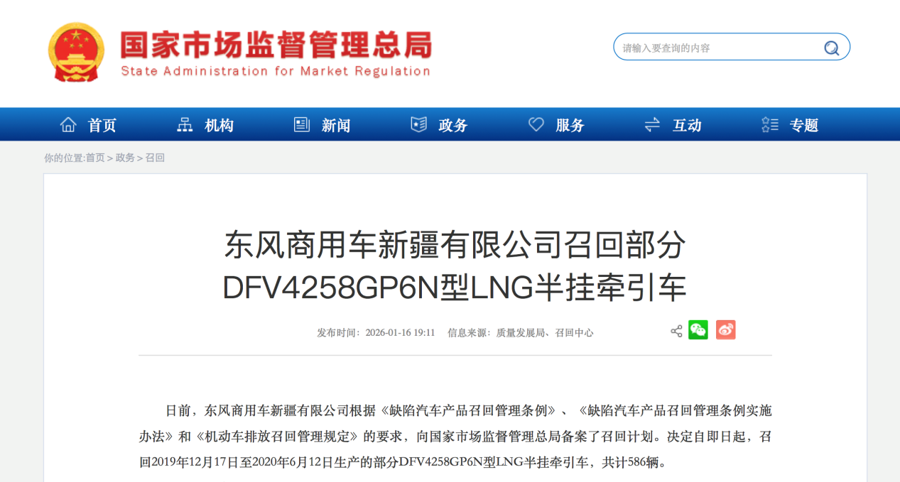 市場監(jiān)管總局網(wǎng)站消息顯示,日前,東風(fēng)商用車新疆有限公司根據(jù)《缺陷汽車產(chǎn)品召回管理?xiàng)l例》、《缺陷汽車產(chǎn)品召回管理?xiàng)l例實(shí)施辦法》和《機(jī)動(dòng)車排放召回管理規(guī)定》的要求,向國家市場監(jiān)督管理總局備案了召回計(jì)劃。決定自即日起,召回2019年12月17日至2020年6月12日生產(chǎn)的部分DFV4258GP6N型LNG半掛牽引車,共計(jì)586輛。