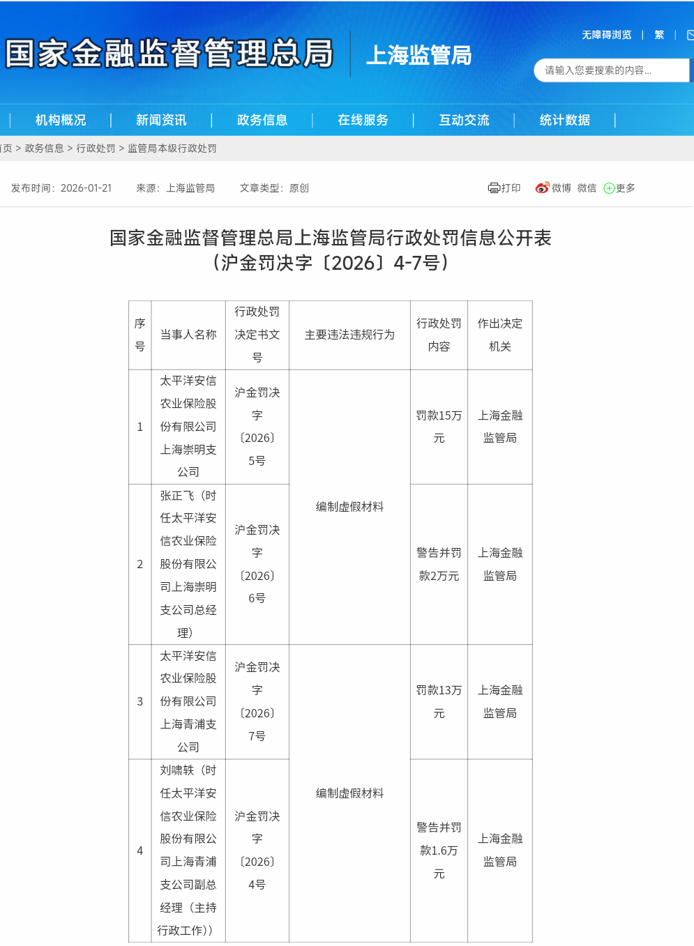 1月21日,國家金融監(jiān)督管理總局上海監(jiān)管局公布行政處罰決定,太平洋安信農(nóng)業(yè)保險股份有限公司(簡稱“太平洋安信農(nóng)險”)上海崇明支公司、青浦支公司因存在編制虛假材料的違法違規(guī)行為,分別被處以15萬元、13萬元罰款,兩家機(jī)構(gòu)合計罰款28萬元。時任兩公司相關(guān)負(fù)責(zé)人分別被給予警告并罰款2萬元、1.6萬元。