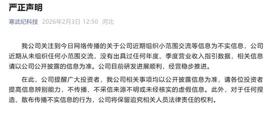 針對市場流傳的“2026年營收指引不及預(yù)期”等傳聞,2月3日午間,寒武紀(jì)(688256.SH)通過其微信公眾號發(fā)布聲明稱,公司關(guān)注到今日網(wǎng)絡(luò)傳播的關(guān)于公司近期組織小范圍交流等信息為不實(shí)信息。