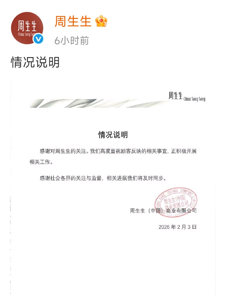 記者注意到,2月3日,“周生生”微博發(fā)布一則情況說明顯示:“感謝對(duì)周生生的關(guān)注。我們高度重視顧客反映的相關(guān)事宜,正積極開展相關(guān)工作。感謝社會(huì)各界的關(guān)注與監(jiān)督,相關(guān)進(jìn)展我們將及時(shí)同步?!?/p>