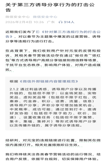 2月4日,“微信安全中心”發(fā)布公告,對(duì)騰訊旗下元寶App春節(jié)營(yíng)銷活動(dòng)中的誘導(dǎo)分享行為進(jìn)行處置,限制其違規(guī)鏈接在微信內(nèi)直接打開,相關(guān)措施即日生效。