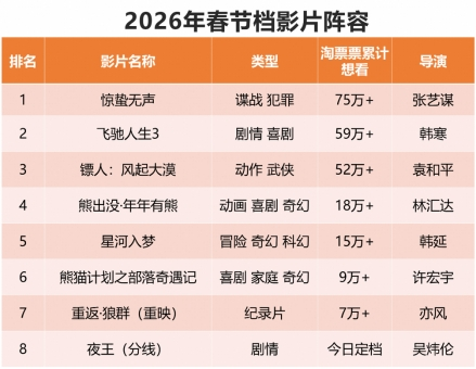 2月6日,燈塔專業(yè)版發(fā)布《2026年春節(jié)檔前瞻》。截至目前,已有8部影片定檔2026年春節(jié)檔。從 “想看”數(shù)據(jù)來看,《驚蟄無聲》《飛馳人生3》《鏢人:風(fēng)起大漠》構(gòu)成頭部主力陣營,《熊出沒·年年有熊》《星河入夢》及《熊貓計(jì)劃之部落奇遇記》則各守類型基本盤。燈塔專業(yè)版前瞻分析認(rèn)為,2026年春節(jié)檔電影市場或從2025年春節(jié)檔的“一超多強(qiáng)”回歸“多強(qiáng)爭霸” 格局。