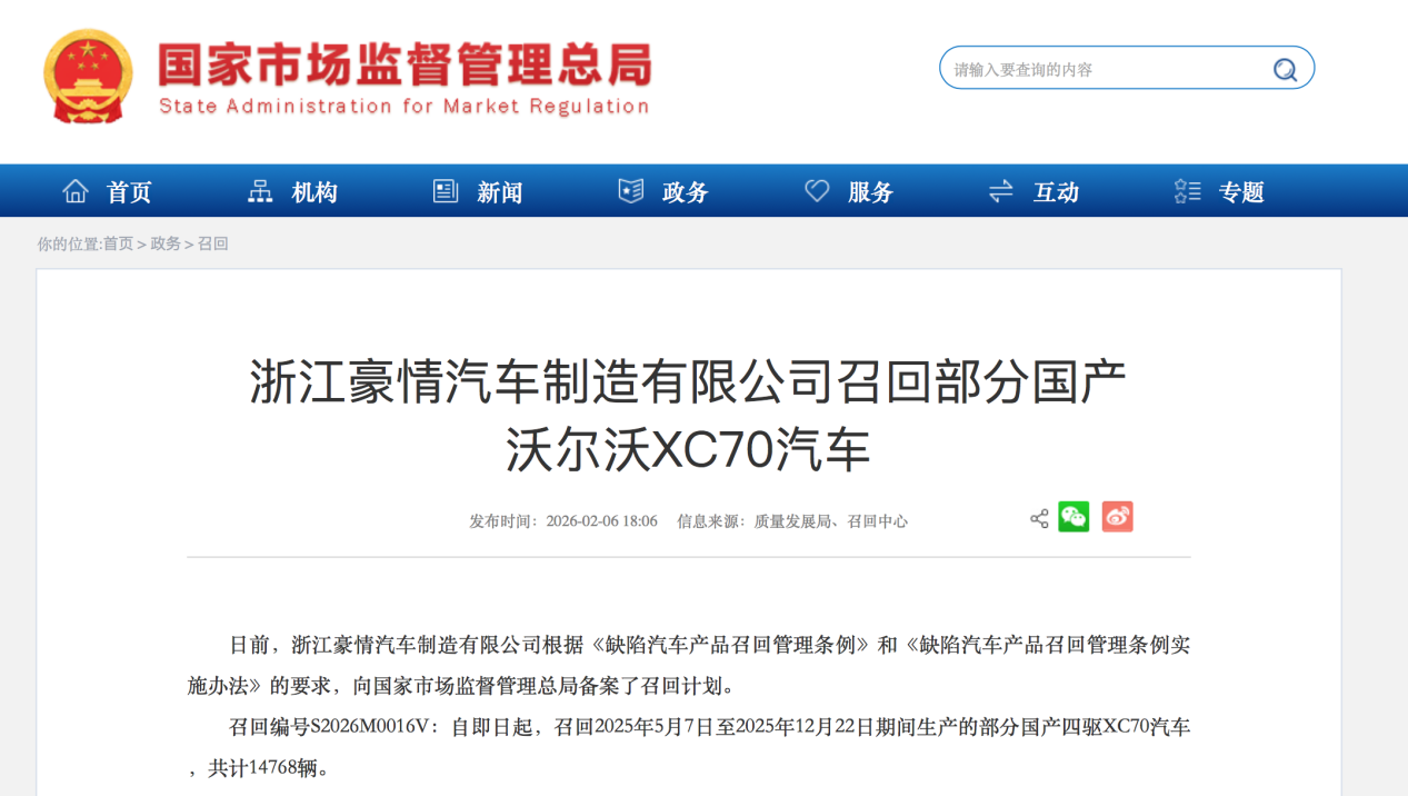 召回編號S2026M0016V:自即日起,召回2025年5月7日至2025年12月22日期間生產(chǎn)的部分國產(chǎn)四驅(qū)XC70汽車,共計14768輛。