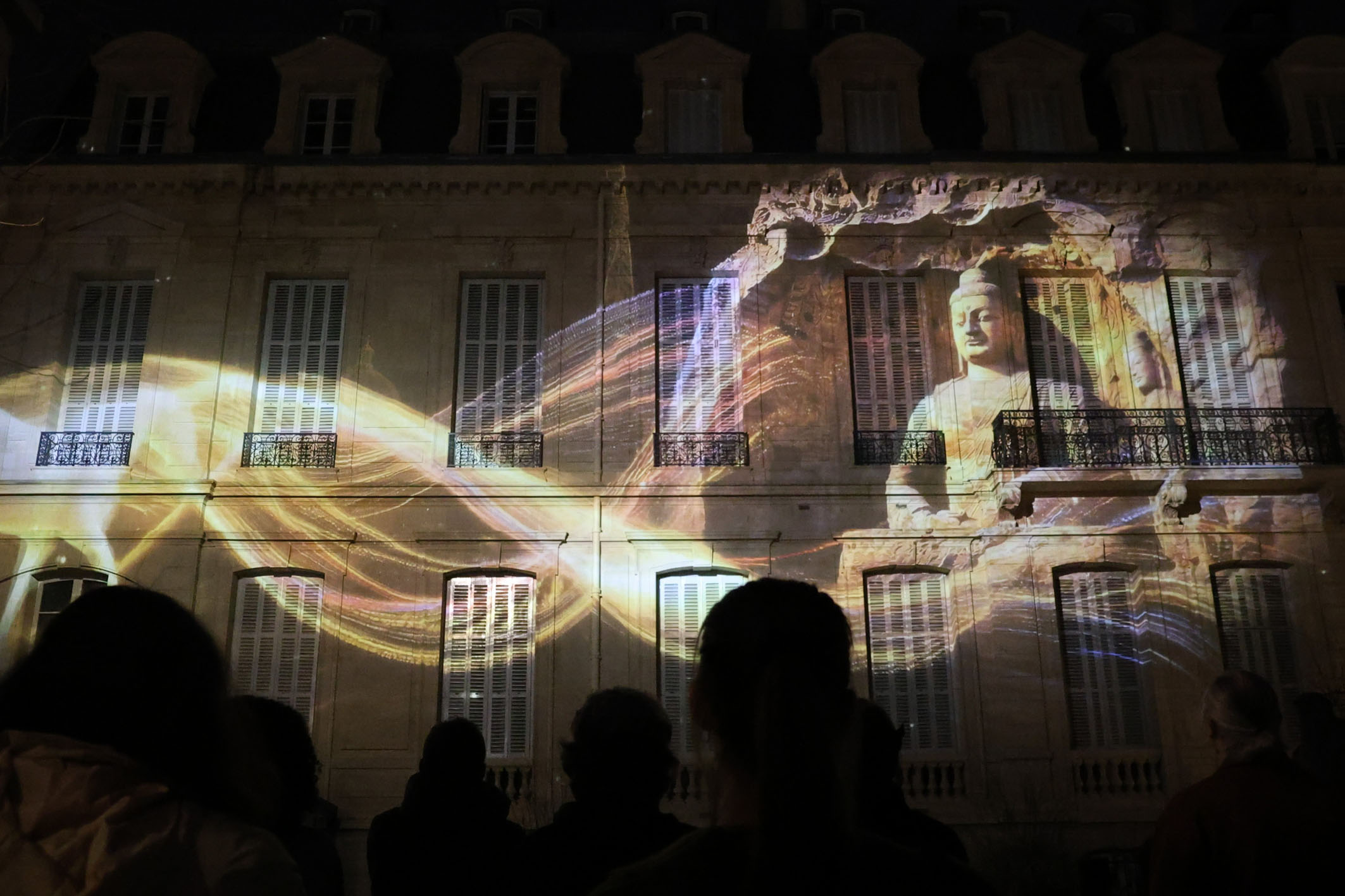 近日,當(dāng)?shù)孛癖娋奂诜▏屠柚袊幕行牡耐ピ簝?nèi)觀賞“云岡石窟之光·巴黎回響”光雕秀。