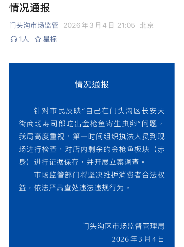 3月4日晚,北京市門頭溝區(qū)市場(chǎng)監(jiān)督管理局就消費(fèi)者反映“在壽司郎門店食用金槍魚時(shí)發(fā)現(xiàn)寄生蟲卵”一事發(fā)布官方通報(bào),已對(duì)涉事門店開展現(xiàn)場(chǎng)檢查、證據(jù)保存,并正式立案調(diào)查。