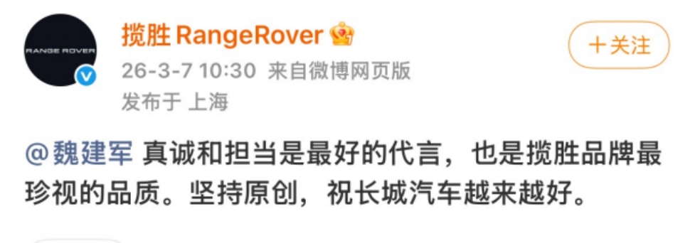 3月7日,攬勝官方微博針對此次事件發(fā)布回應,稱“真誠和擔當是最好的代言,也是攬勝品牌最珍視的品質”,在重申堅持原創(chuàng)立場的同時表示“祝長城汽車越來越好”。