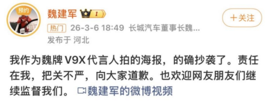 近日,長城汽車董事長魏建軍就旗下魏牌V9X代言海報涉嫌抄襲路虎攬勝運動版海報一事發(fā)布視頻公開致歉,明確承認抄襲事實并表示愿承擔全部法律與經(jīng)濟責任。