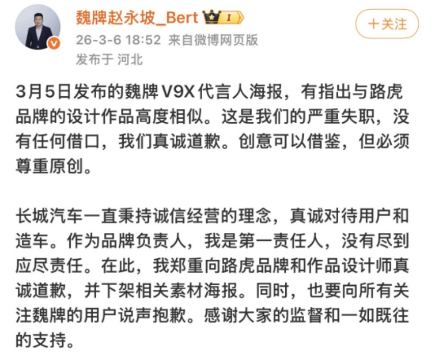 魏牌CEO趙永坡也同步在社交平臺發(fā)文致歉,稱此次事件是團隊的嚴重失職,沒有任何借口,同時強調“創(chuàng)意可以借鑒,但必須尊重原創(chuàng)”。