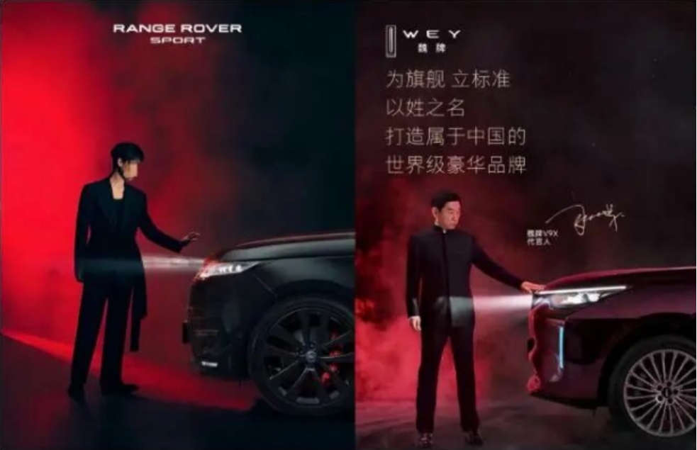 同時,有網(wǎng)友發(fā)布對比圖指出,該海報與路虎攬勝運動版的廣告海報高度雷同,二者在暗紅背景、人物與車身的構圖方式、車輛展示角度、燈光走向及人物站姿上高度一致,僅手部動作存在細微差異,有網(wǎng)友還直言該創(chuàng)意被“等比抄襲”。