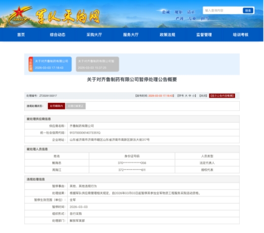 公告顯示,齊魯制藥有限公司因“其他、其他違規(guī)行為”被處理。根據(jù)軍隊(duì)供應(yīng)商管理相關(guān)規(guī)定,自2026年3月3日起,暫停其參加全軍物資工程服務(wù)采購活動(dòng)資格,組織形式為自行采購,處理部門為解放軍某部。