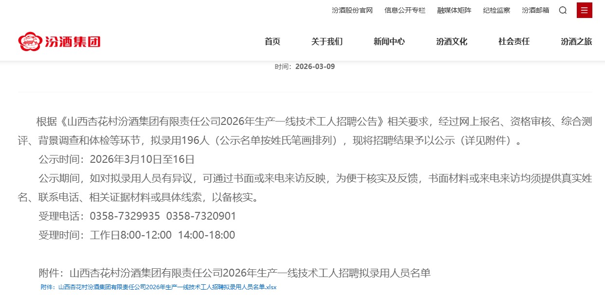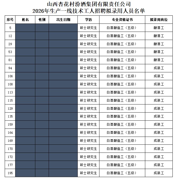 近日,山西杏花村汾酒集團(tuán)有限責(zé)任公司(以下簡稱“汾酒集團(tuán)”)發(fā)布2026年生產(chǎn)一線技術(shù)工人招聘結(jié)果公示,擬錄用196名生產(chǎn)一線技術(shù)工人,其中19名碩士研究生擬被錄用為釀酒工和成裝工引發(fā)關(guān)注。