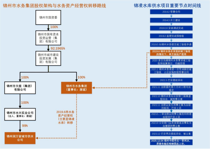 圖為錦州水務集團股權結構及錦凌水庫供水項目時間線(資料來源:天眼查及公開資料,制圖:郭新志)