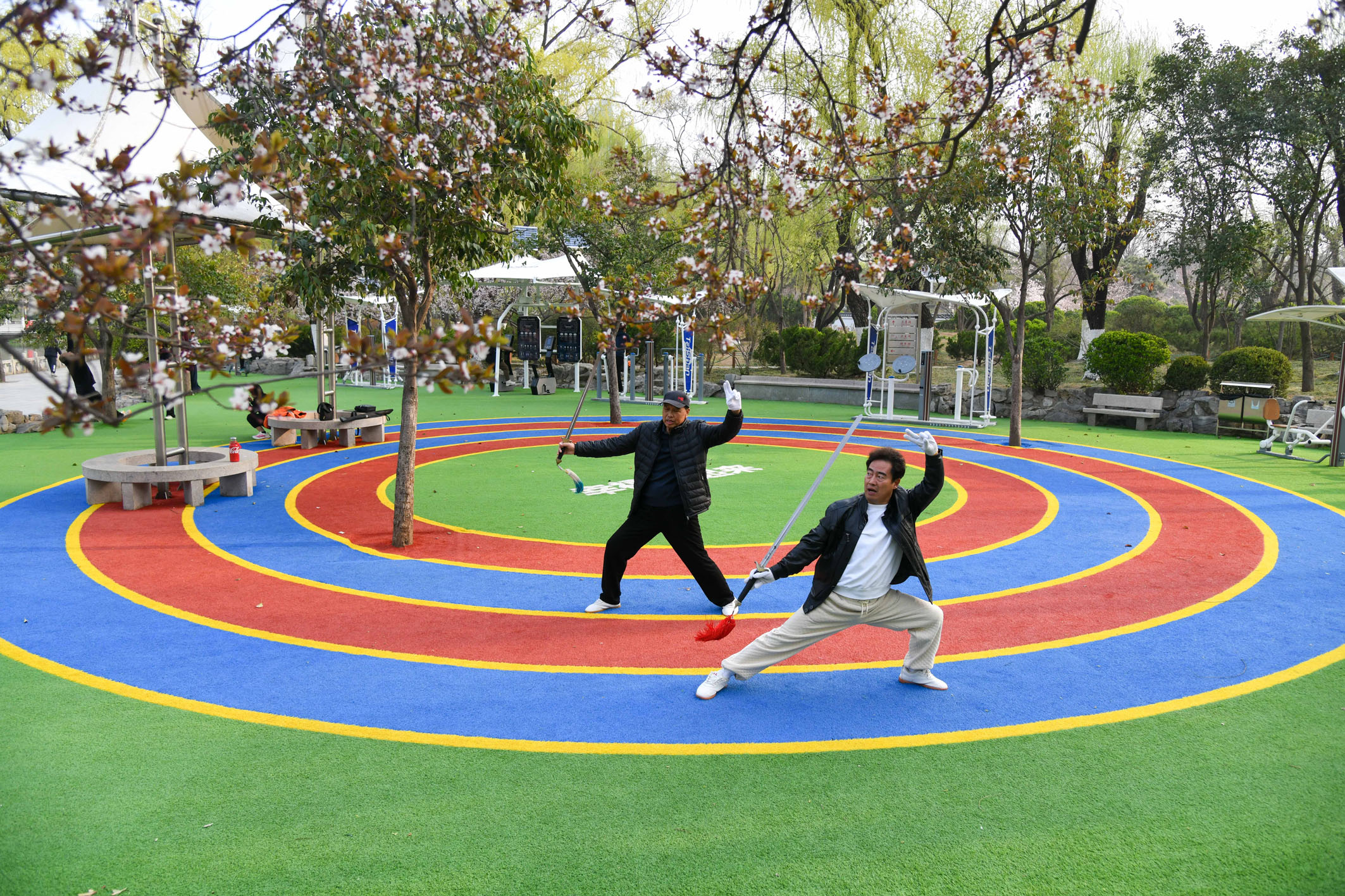 圖為近日在濟(jì)南泉城公園內(nèi),健身愛好者在全齡智能健身區(qū)練習(xí)太極劍。