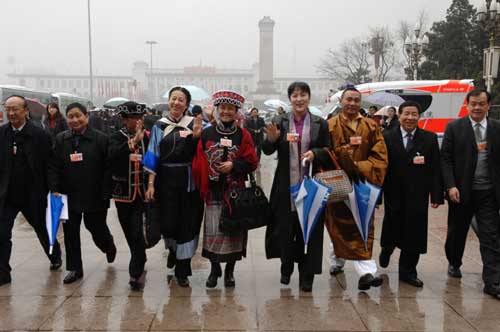 3月3日15時(shí),中國(guó)人民政治協(xié)商會(huì)議第十屆全國(guó)委員會(huì)第五次會(huì)議在北京人民大會(huì)堂開幕。這是全國(guó)政協(xié)委員在北京的春雨中走向人民大會(huì)堂。