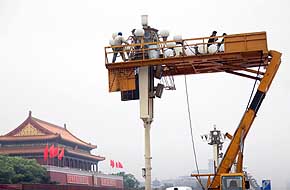 工人乘坐升降車為北京天安門城樓西側(cè)的華燈更換新型節(jié)能光源。新華社發(fā) | “雖然去年節(jié)能減排任務(wù)沒能完成,但從某個(gè)角度來看,卻體現(xiàn)了政府執(zhí)政能力的進(jìn)步,至少是勇于提出挑戰(zhàn),直面問題。”全國人大代表、皇明太陽能集團(tuán)有限公司董事長(zhǎng)黃鳴表示,“敢于直面問題才會(huì)有所突破。溫總理已經(jīng)在政府工作報(bào)告中表示,今年要把節(jié)能降耗、保護(hù)環(huán)境和集約用地作為轉(zhuǎn)變經(jīng)濟(jì)增長(zhǎng)方式的突破口和重要抓手,由此可見,2007年的節(jié)能減排將成為經(jīng)濟(jì)工作的重中之重,也是關(guān)系到整個(gè)‘十一五’期間節(jié)能減排指標(biāo)能否順利實(shí)現(xiàn)的關(guān)鍵之所在! “政府工作報(bào)告中對(duì)節(jié)能減排給予了高度重視,這是此前從未有過的!弊叱鋈嗣翊髸(huì)堂,來自香港特別行政區(qū)的全國人大代表王英偉這樣告訴記者,“從溫總理的政府工作報(bào)告中,我們可以深切的體會(huì)到,國家已經(jīng)認(rèn)識(shí)到了節(jié)能減排的重要性,如果高耗能、高排放的情況不能盡快改善,我國在今后的發(fā)展中就會(huì)遇到很多瓶頸,從而對(duì)國家的進(jìn)一步發(fā)展造成很大制約! 王英偉表示,盡管政府在節(jié)能減排方面有很大決心,但2007年的節(jié)能減排任務(wù)仍相當(dāng)艱巨!皽乜偫碓谡ぷ鲌(bào)告中指出了今年節(jié)能環(huán)保方面的八個(gè)重點(diǎn),但這些想法一定要落實(shí)到地方政府,希望地方政府能夠加大力度去執(zhí)行,這是節(jié)能減排任務(wù)能否完成的關(guān)鍵!